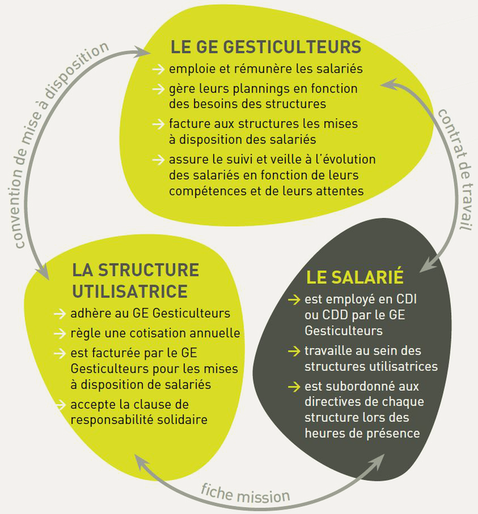 Le GE Gesticulteurs n’endossent donc aucune responsabilité à l’égard du contenu délégué par les co-employeurs ; le rôle du GE est simplement de veiller au respect des heures, tant au regard de l’organisation du travail de chaque salarié que des besoins de chaque adhérent·es. Les emplois du temps réalisés au niveau de la coordination permettent de sécuriser la gestion du temps et de décompter avec précision le temps passé pour chacun.